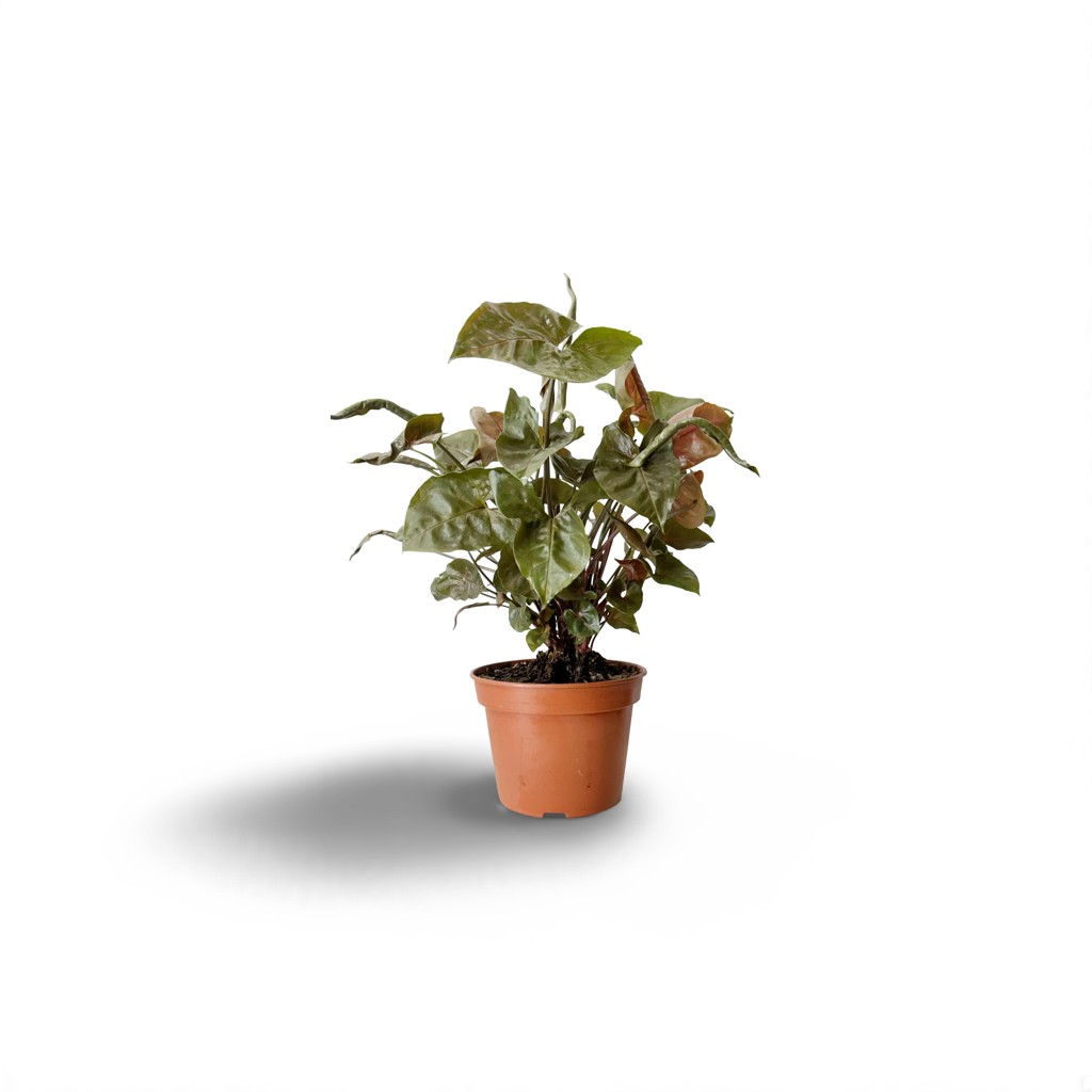 Данный сорт сингониума выглядит более строгим, чем Неон Пинк, хотя розовый оттенок на листве тоже присутствует. Листовые пластинки более плотные. Они окрашены в темно-зеленый цвет, а коричневые и розовые полоски видны лишь у центра листа. Верхняя часть листьев блестящая и приятная на ощупь. Прожилки имеют красный оттенок.
